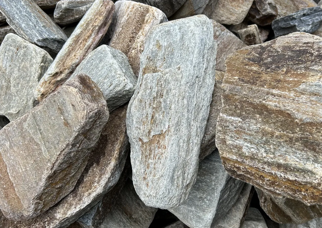 Пласты галтованного сланца серо-коричневого цвета. По своей фактуре напоминают состаренную древесину. Куски весом 10 – 50 кг. Используется для декорирования, декоративной кладки.
